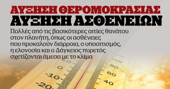 Και αν νομίζετε ότι απαιτείται κάποια μεγάλη αύξηση στην θερμοκρασία για να μας πλήξουν περισσότερες και πιο σοβαρές ασθένειες, κάνετε λάθος. Αρκούν μόλις 1-3 βαθμοί Κελσίου μεγαλύτερη μέση θερμοκρασία, για να έχουμε εκατοντάδες χιλιάδες περισσότερους θανάτους σε όλο τον κόσμο.