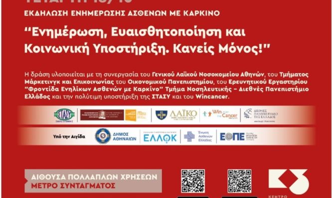 Ενημερωτική δράση για την υποστήριξη των ογκολογικών ασθενών, των φροντιστών και των οικογενειών τους θα διεξαχθεί αύριο Τετάρτη 18 Οκτωβρίου 2023 στο Μετρό Συντάγματος, στην Αθήνα.