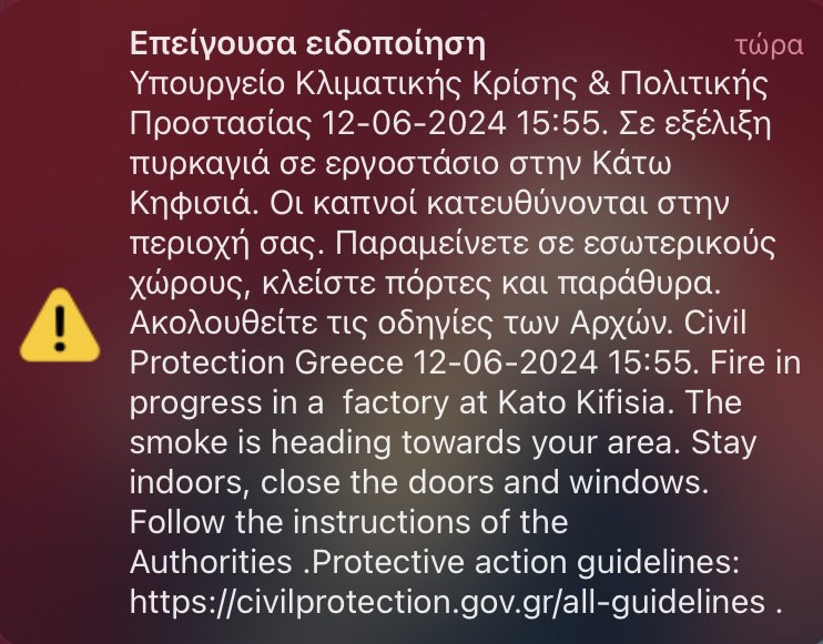 Επίσης, έχει σταλεί 112 στους κατοίκους της περιοχής εξαιτίας των πυκνών καπνών με οδηγίες προς τους πολίτες να παραμείνουν σε εσωτερικούς χώρους και να κλείσουν πόρτες και παράθυρα.
