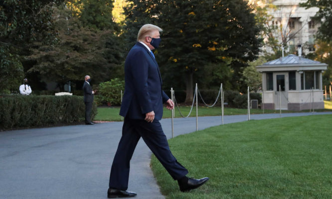 Εντωμεταξύ, αν και ο Τραμπ δεν αποδέχεται τα προληπτικά μέτρα, όπως είναι η μάσκα, εξερχόμενος από τον Λευκό Οίκο και στο δρόμο για στρατιωτικό νοσοκομείο, φορούσε μια μαύρη προστατευτική μάσκα, για να μη διαδώσει τη λοίμωξη σε άλλους ανθρώπους.
