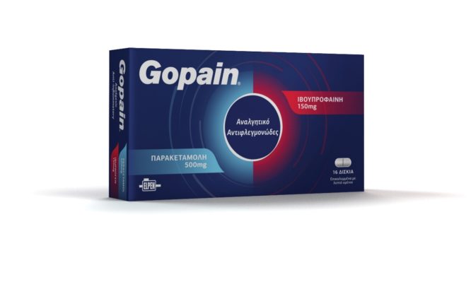 Πρόκειται για το Gopain, ένα νέο αναλγητικό και αντιφλεγμονώδες σκεύασμα, το οποίο περιέχει το μοναδικό συνδυασμό δυο καταξιωμένων δραστικών ουσιών, της παρακεταμόλης και της ιβουπροφαίνης σε ένα μόνο δισκίο. Η χρήση του ενδείκνυται για βραχυπρόθεσμη συμπτωματική θεραπεία του ήπιου έως μέτριου πόνου, με τη δράση του να ξεκινά από τα πρώτα 10 λεπτά.