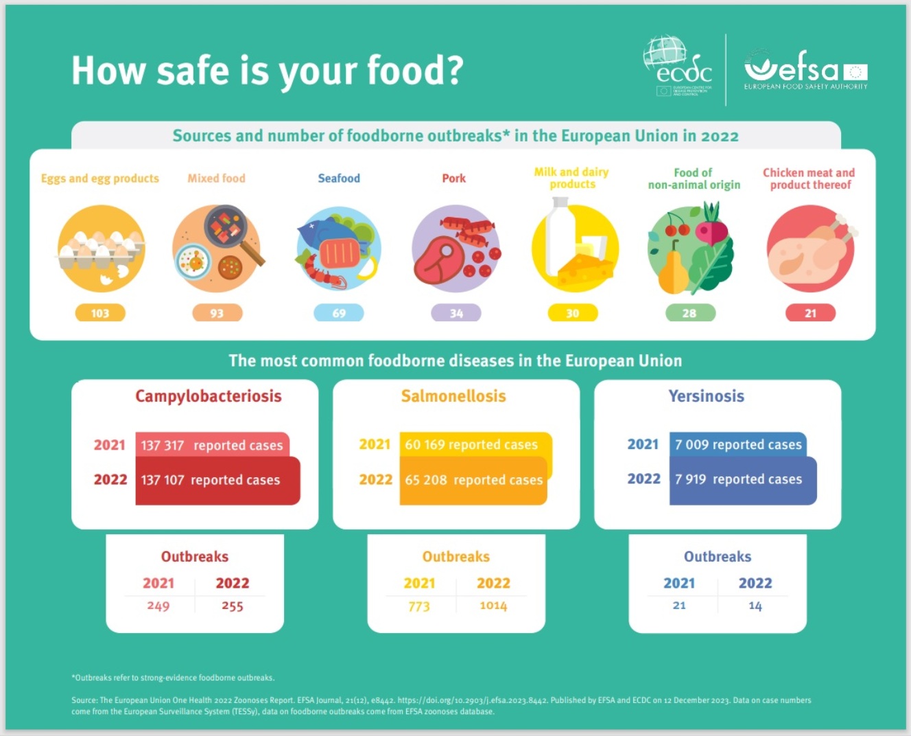 Εκατοντάδες χιλιάδες άνθρωποι έπαθαν το 2022 τροφική δηλητηρίαση στην Ευρωπαϊκή Ένωση, με τα μολυσμένα κρέατα και τα ζωικής προελεύσεως τρόφιμα να οφείλονται για τα περισσότερα περιστατικά.