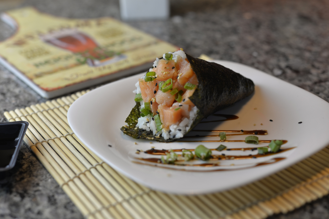 Σε σχήμα χωνιού παγωτού, συνδυάζει ωμό ψάρι και ρύζι για σούσι – τυλιγμένο σε ένα λεπτό σαν χαρτί φύλλο από αποξηραμένα φύκια, γνωστό ως nori.