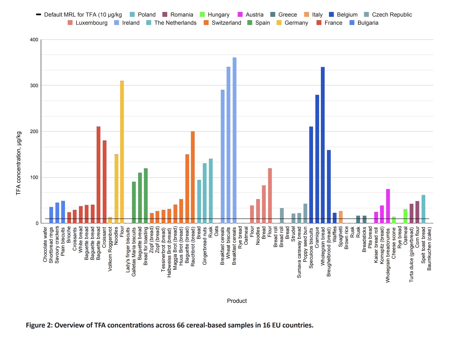 Η μελέτη ανέλυσε 65 συμβατικά προϊόντα δημητριακών που αγοράστηκαν σε 16 ευρωπαϊκές χώρες (συμπεριλαμβανομένης της Ελλάδας) – η πρώτη μελέτη του είδους της σε επίπεδο ΕΕ. Προηγούμενες αναφορές έχουν διαπιστώσει υψηλά επίπεδα TFA στο κρασί και κάποια μόλυνση του νερού της βρύσης. Είναι διαλυτό στο νερό, που σημαίνει ότι μπορεί να απορροφηθεί από τα φυτά από το έδαφος.