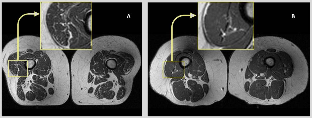 Εικόνες μαγνητικής τομογραφίας από τις πλευρικές πτυχές των τετρακέφαλων μηριαίων μυών δύο γυναικών που συμμετείχαν στη μελέτη, ηλικίας 58 (Α) και 62 ετών (Β). Στη γυναίκα Α, της οποίας η διατροφή αποτελείτο κατά 68% από υπερεπεξεργασμένες τροφές, οι μηριαίοι μύες παρουσιάζουν πολλές λιπαρές ραβδώσεις. Στη γυναίκα Β, που η διατροφή περιείχε μόνο 36% υπερεπεξεργασμένα τρόφιμα, οι μύες των μηρών παρουσιάζουν λιγότερες λιπαρές ραβδώσεις.