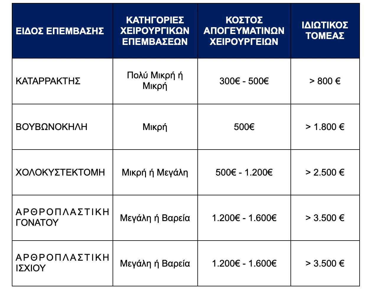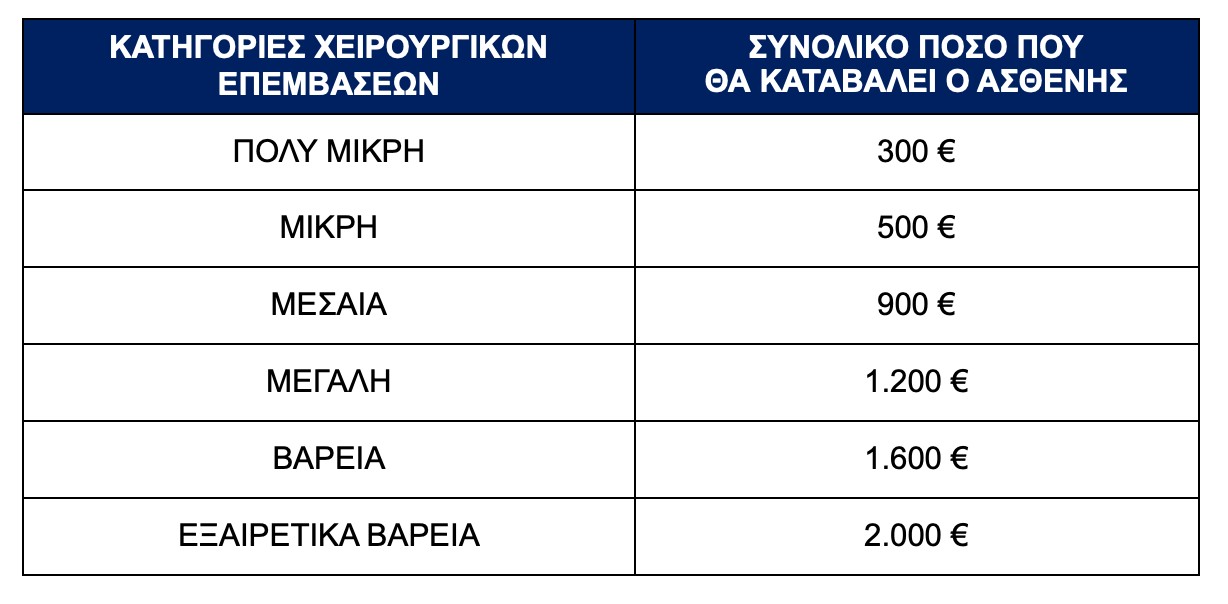 Για την λειτουργία των απογευματινών χειρουργείων έχει δημιουργηθεί η κατηγοριοποίηση των χειρουργικών επεμβάσεων, με βάση ιατρικά κριτήρια. Οι συγκεκριμένες κατηγορίες επεμβάσεων αντιστοιχούν και στα αντίστοιχα κόστη που θα προκύψουν από τη διενέργεια των συγκεκριμένων επεμβάσεων.