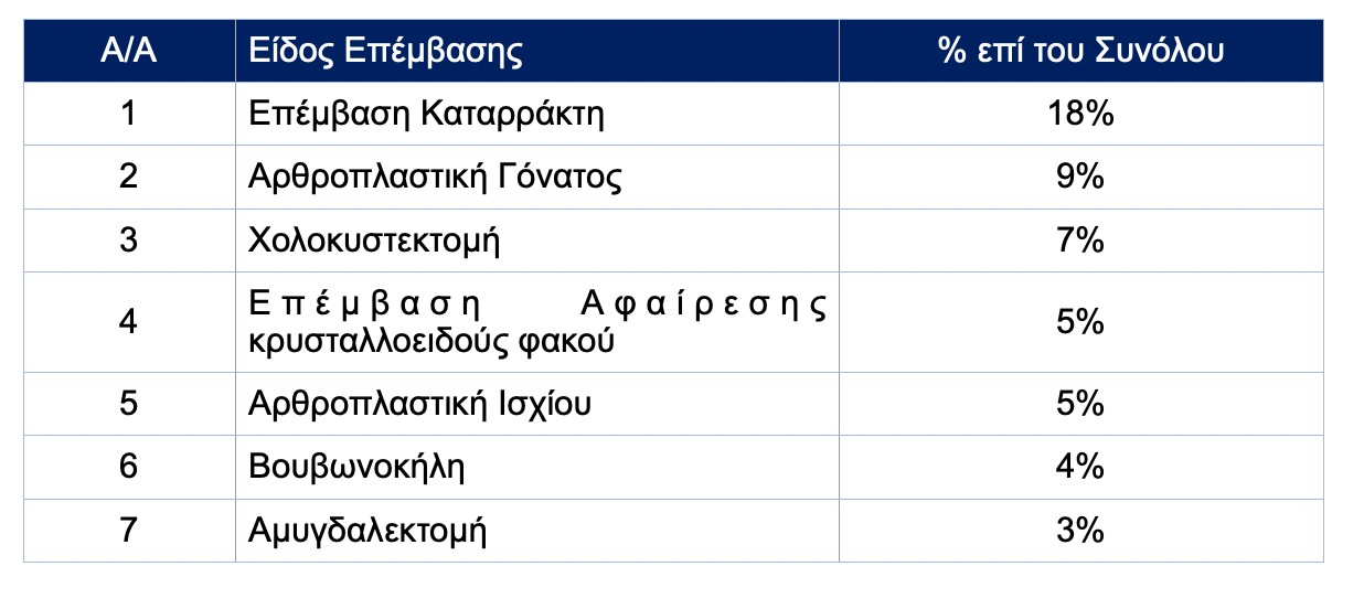 Σύμφωνα με την ανάλυση του Υπουργείου Υγείας, οι βασικές κατηγορίες επέμβασης που παρατηρούνται στα Νοσοκομεία φαίνονται στον παρακάτω πίνακα. Αξίζει να σημειωθεί ότι πάνω από το 50% των επεμβάσεων σε αναμονή στη χώρα συγκεντρώνεται στις παρακάτω 7 κατηγορίες.