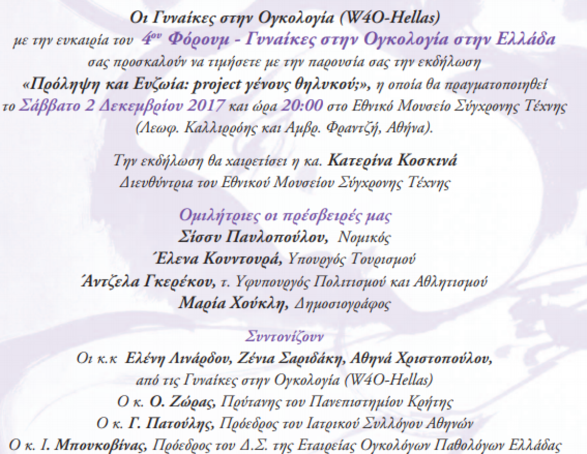 Στο πλαίσιο του Forum, διοργανώνεται ξεχωριστή κοινωνική εκδήλωση με θέμα «Πρόληψη και Ευζωία: project γένους θηλυκού;» με την συμμετοχή σημαντικών γυναικών-πρέσβειρων των σκοπών των ‘Γυναικών στην Ογκολογία’, από το χώρο των γραμμάτων και της πολιτικής. Την εκδήλωση, η οποία θα πραγματοποιηθεί το Σάββατο 2 Δεκεμβρίου 2017 και ώρα 20:00 στο Εθνικό Μουσείο Σύγχρονης Τέχνης, θα πλαισιώσει μουσικά η Μαρίνα Σάττι και οι Fonέs.