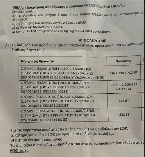 Πρόκειται συγκεκριμένα για 5.890 τεμάχια του φαρμάκου σεμαγλουτίδη (Ozempic) σε συσκευασία μηνιαίας και τριμηνιαίας θεραπείας και σε περιεκτικότητα 0.5 και 1 mg. Σκευάσματα τα οποία “λιμνάζουν” στις αποθήκες του Ινστιτούτου Φαρμακευτικής Έρευνας και Τεχνολογίας (ΙΦΕΤ) εδώ και σχεδόν ενάμιση χρόνο.