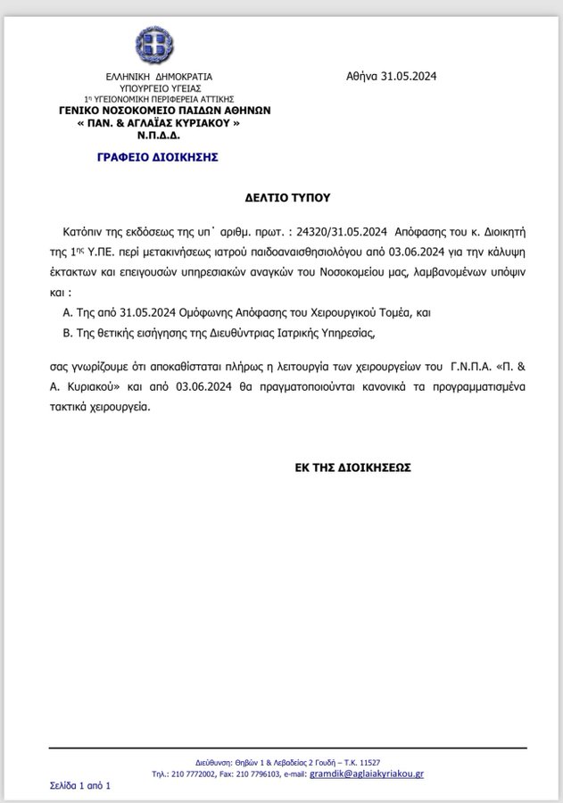 Όπως ανακοινώθηκε από τη διοίκηση του νοσοκομείου, κατόπιν εκδόσεως σχετικής απόφασης από τον διοικητή της 1ης Υ.ΠΕ. περί μετακινήσεως ιατρού παιδοαναισθησιολόγου για την κάλυψη έκτακτων και επειγουσών υπηρεσιακών αναγκών του νοσοκομείου, λαμβανομένων υπόψιν και της ομόφωνης απόφασης του Χειρουργικού Τομέα και της θετικής εισήγησης της Διευθύντριας Ιατρικής Υπηρεσίας, αποκαθίσταται πλήρως η λειτουργία των χειρουργείων.