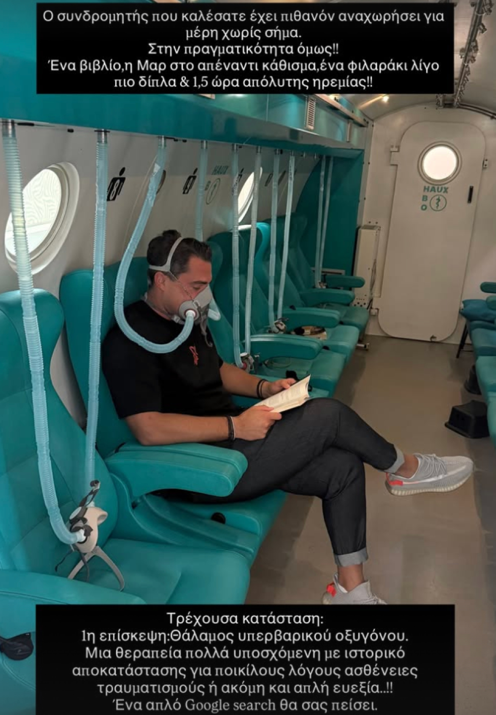 «Ο συνδρομητής που καλέσατε έχει πιθανόν αναχωρήσει για μέρη χωρίς σήμα. Στην πραγματικότητα όμως! Ένα βιβλίο, Μαριαλένα στο απέναντι κάθισμα, ένα φιλαράκι λίγο πιο δίπλα και 1,5 ώρα απόλυτης ηρεμίας. Τρέχουσα κατάσταση; 1η επίσκεψη: Θάλαμος υπερβαρικού οξυγόνου. Μια θεραπεία πολλά υποσχόμενη με ιστορικό αποκατάστασης για ποικίλους λόγους, ασθένειες, τραυματισμούς ή ακόμη και απλή ευεξία! Ένα απλό Google search θα σας πείσει. Keep going επιθετικά μέχρι την επίλυση του προβλήματος», έγραψε ως λεζάντα ο νικητής του Survivor 2021 και του All Star.