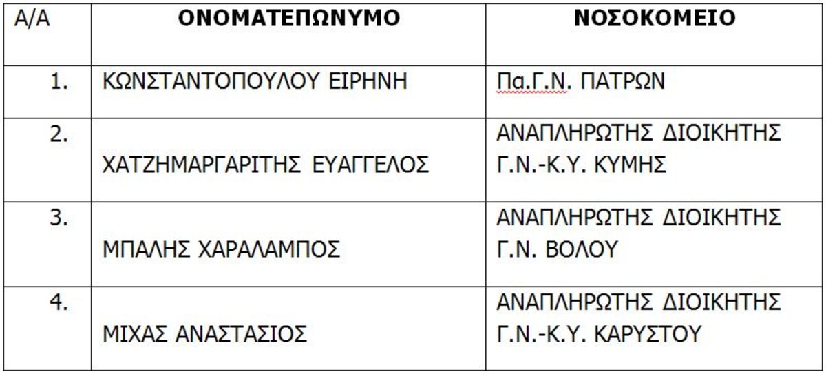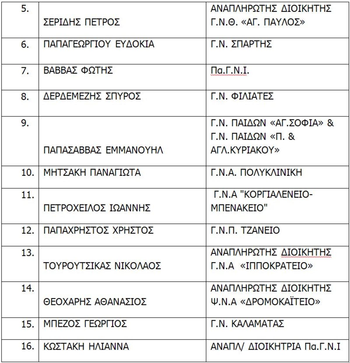 Πιο συγκεκριμένα από τους συνολικά 127 διοικητές και αναπληρωτές διοικητές που υπηρετούσαν στα νοσοκομεία της χώρας το Νοέμβριο του 2015, παραμένουν στις θέσεις τους οι κάτωθι: