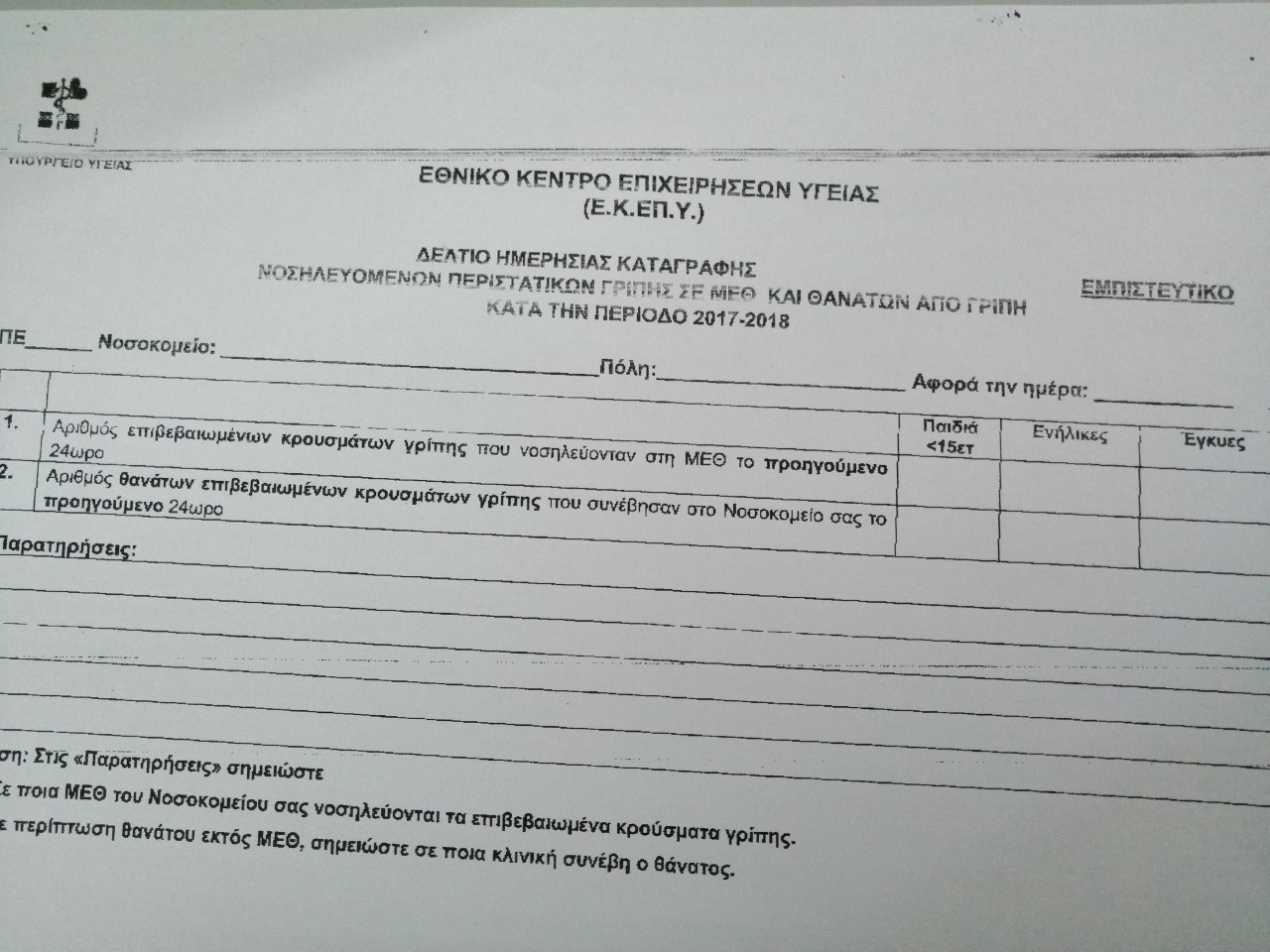 Το ΚΕΕΛΠΝΟ απέστειλε φόρμα στα Νοσοκομεία, η οποία θα πρέπει να συμπληρώνεται καθημερινά από τα Νοσοκομεία, στην οποία θα αναφέρεται ο αριθμός των ασθενών με διαγνωσμένη γρίπη στις κλινικές, στις ΜΕΘ και οι θάνατοι από διαγνωσμένη γρίπη.
