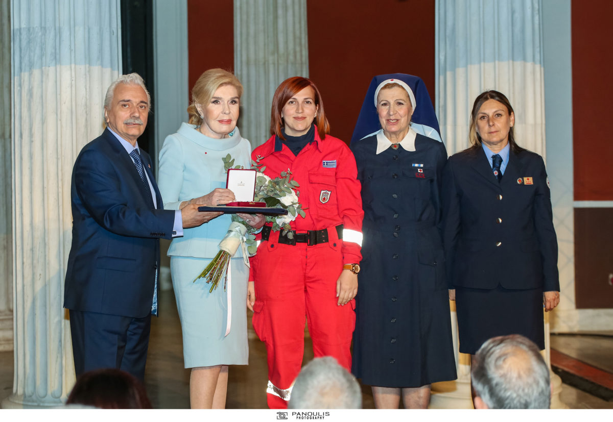 Με τιμάτε βαθιά και μου δίνετε ακόμα μεγαλύτερη δύναμη σε αυτή τη δύσκολη πορεία. Ευχαριστώ ολόθερμα τον Ελληνικό Ερυθρό Σταυρό και τον Πρόεδρό του, Δρ Αντώνη Αυγερινό, για την τόσο τιμητική αυτή διάκριση καθώς επίσης και για την ανεκτίμητη συμπαράστασή τους στο έργο των Συλλόγων ΕΛΠΙΔΑ και ΟΡΑΜΑ ΕΛΠΙΔΑΣ, καθώς έχουν θέσει το μεγαλύτερο δίκτυο εθελοντών στην Ελλάδα στην υπηρεσία των παιδιών με καρκίνο… Με συγκινεί βαθιά το γεγονός πως σε λίγη ώρα, στην κορυφαία και πιο συμβολική στιγμή αυτής της βραδιάς, θα τιμήσουμε τους Έλληνες εθελοντές του Ερυθρού Σταυρού.