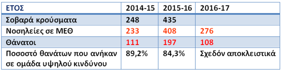 Η μεγάλη πλειοψηφία των ασθενών που νοσηλεύτηκαν σε Μ.Ε.Θ. ή πέθαναν από εργαστηριακά επιβεβαιωμένη γρίπη, δεν είχαν κάνει το αντιγριπικό εμβόλιο παρ’ ότι άνηκαν σε ομάδα προτεραιότητας για την οποία συστήνεται ο εμβολιασμός. Τούτο καταδεικνύει τη σημασία του αντιγριπικού εμβολιασμού, ως το καλύτερο διαθέσιμο μέσο προστασίας από τη γρίπη.