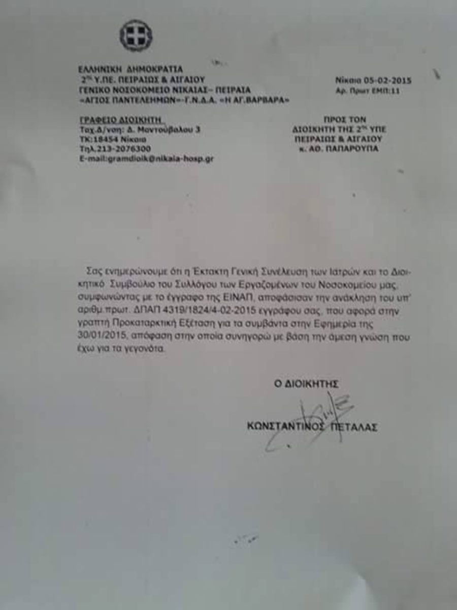 Ο κ. Παπανικολάου εγκαλέστηκε από τον διοικητή της αρμόδιας 2ης ΥΠΕ επειδή προχθές σε ιστοσελίδα κοινωνικής δικτύωσης περιέγραψε τις ελλείψεις στο νοσοκομείο της Νίκαιας, ελλείψεις που όλοι γνωρίζουμε εδώ και χρόνια. Η ανάρτηση έγινε γνωστή στον υπουργό Υγείας, Παναγιώτη Κουρουμπλή, ο οποίος επικοινώνησε με τον κ. Παπανικολάου για να πληροφορηθεί περισσότερες λεπτομέρειες και υποσχέθηκε να βοηθήσει σύντομα.