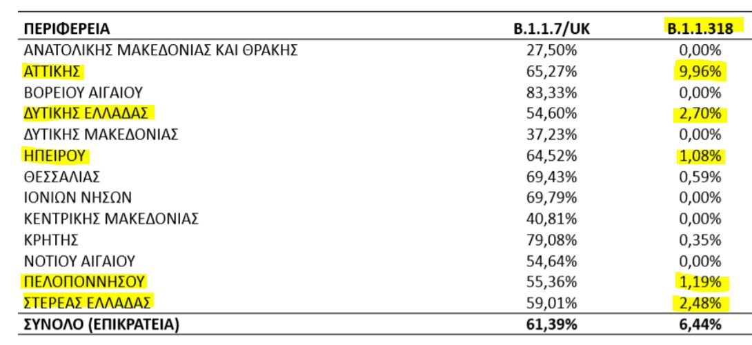 Δείτε τον σχετικό πίνακα του ΕΟΔΥ, με τα ποσοστά των μεταλλαγμένων σε όλη την Ελλάδα. Στην πρώτη στήλη εμφανίζονται τα ποσοστά του βρετανικού στελέχους και στη δεύτερη του Β.1.1.318.