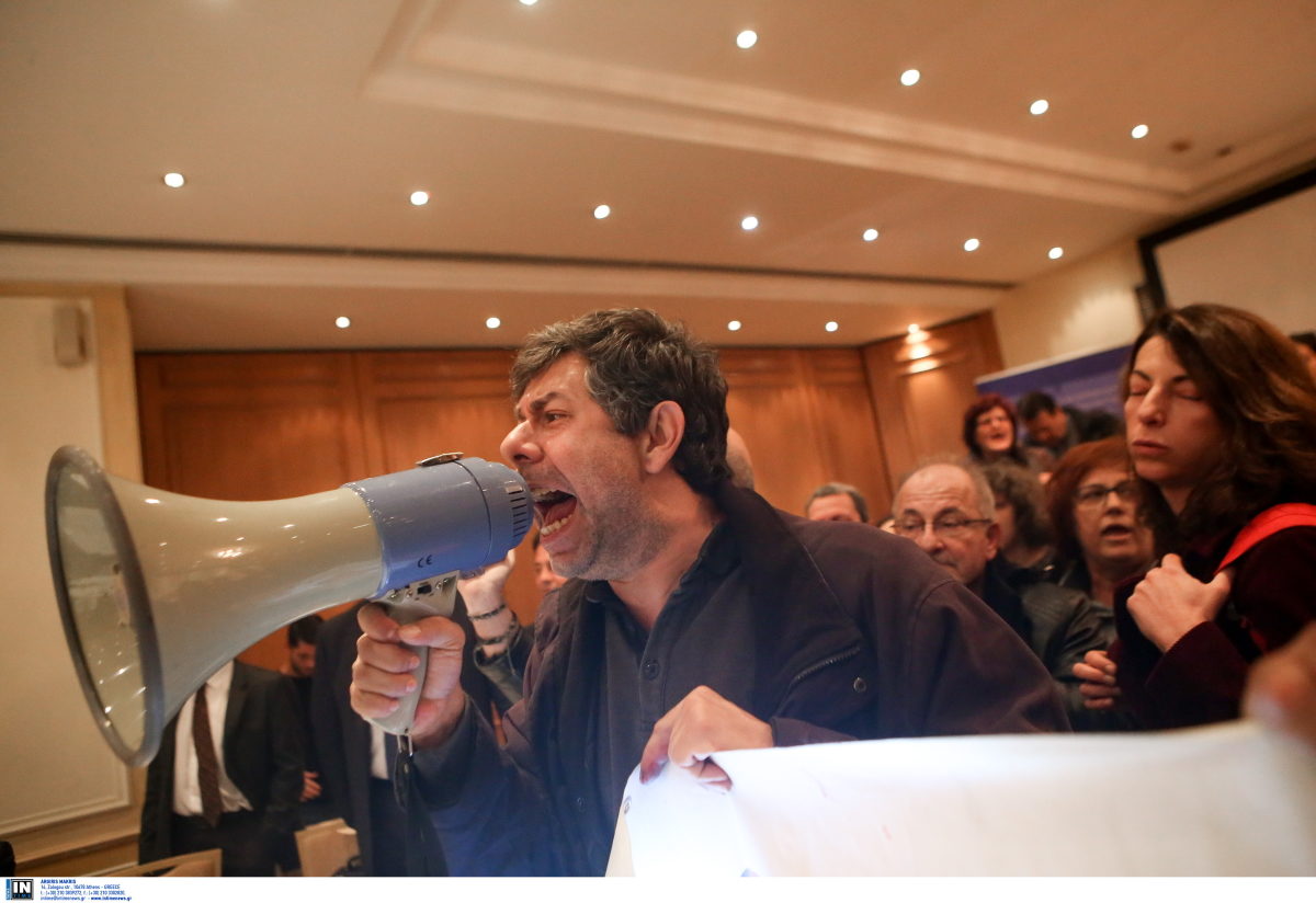 Οι συνδικαλιστές μπήκαν στην αίθουσα με ντουντούκες και φωνάζοντας συνθήματα όπως “δωρεάν υγεία για όλο τον λαό”.