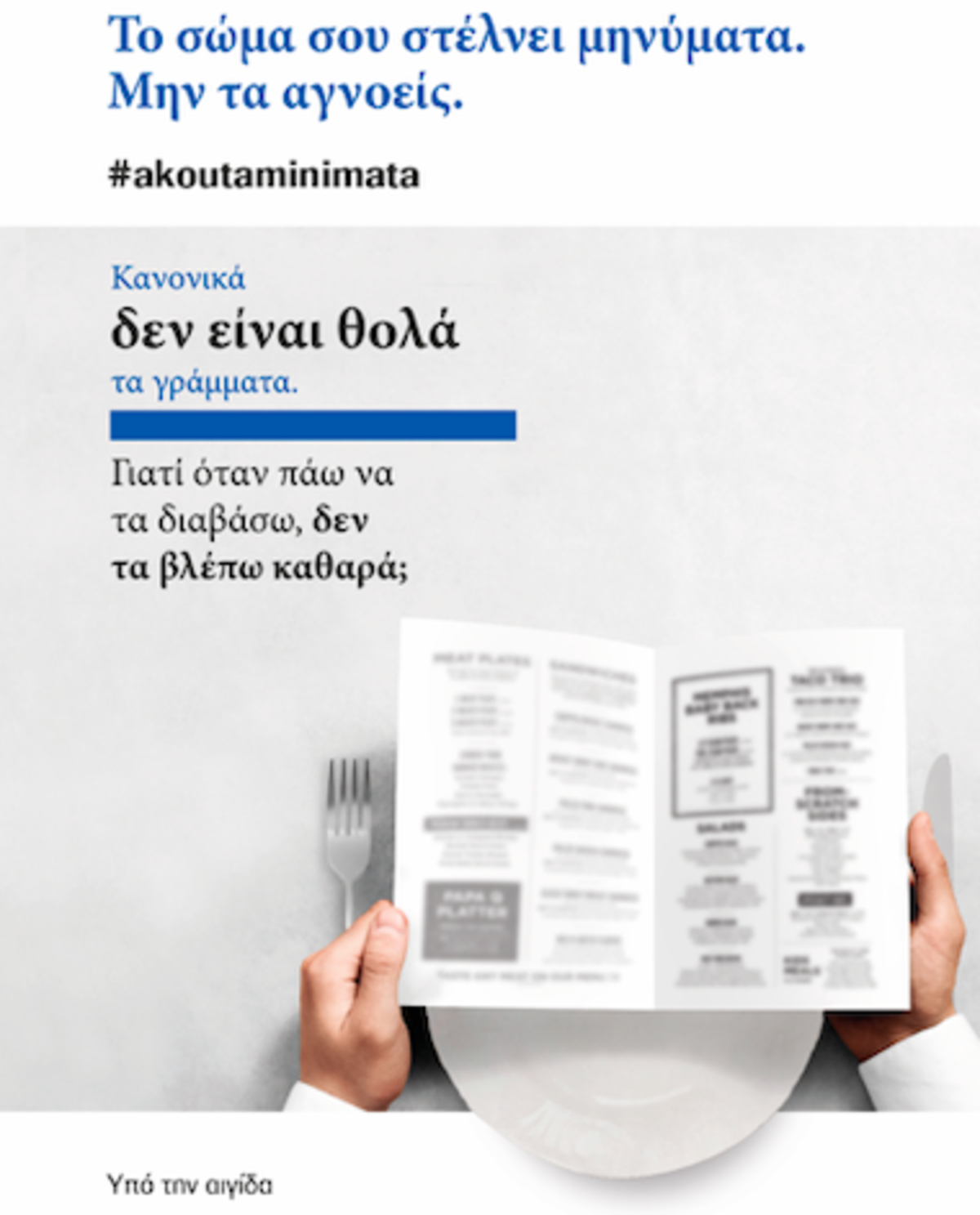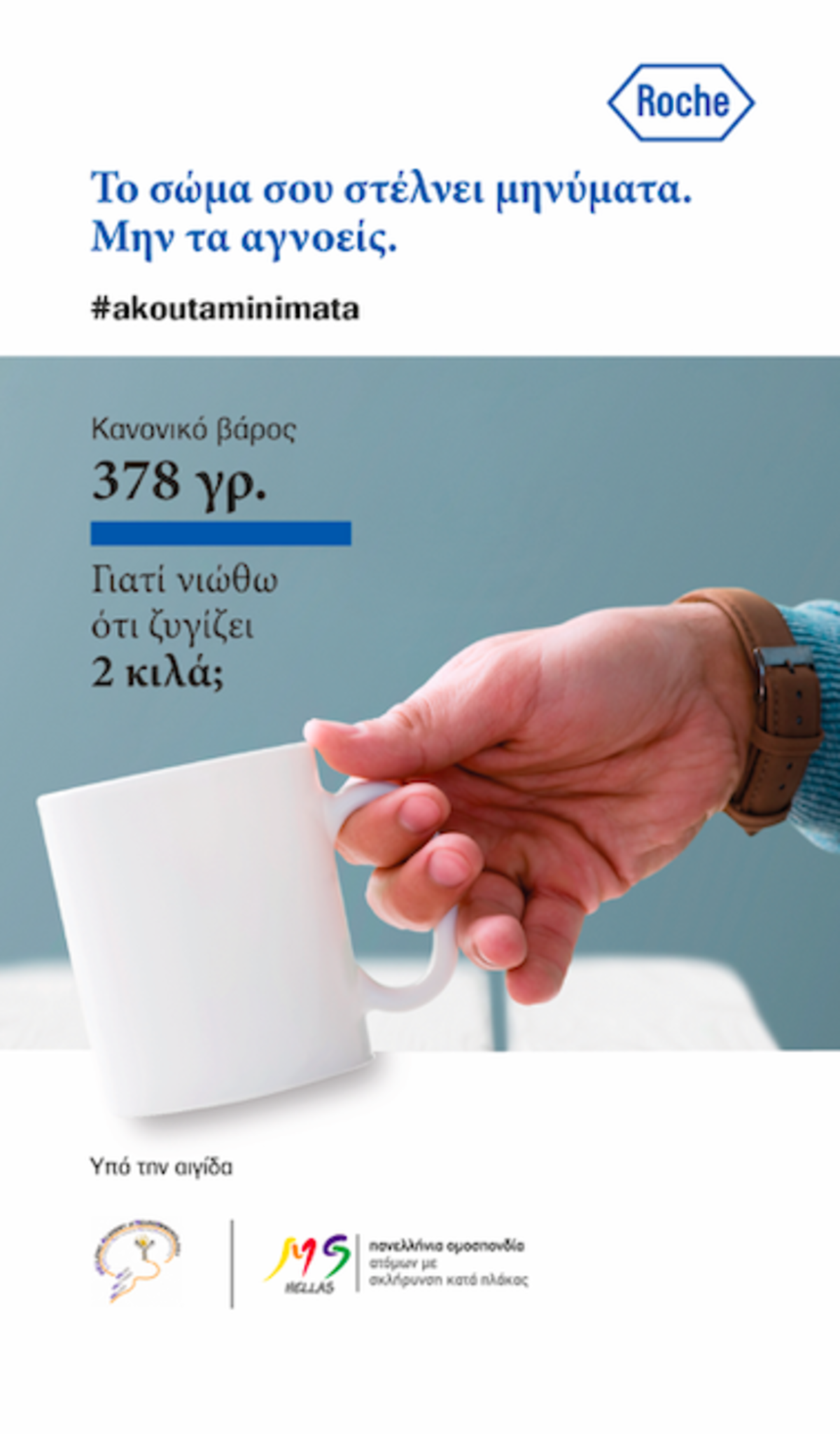 H εκστρατεία «Το σώμα σου στέλνει μηνύματα. Mην τα αγνοείς!» #akoutaminimata αποτελεί μία πρωτοβουλία της Roche Hellas που τελεί υπό την αιγίδα της Ελληνικής Ακαδημίας Νευροανοσολογίας και της Πανελλήνιας Ομοσπονδίας Ατόμων με Σκλήρυνση κατά Πλάκας.