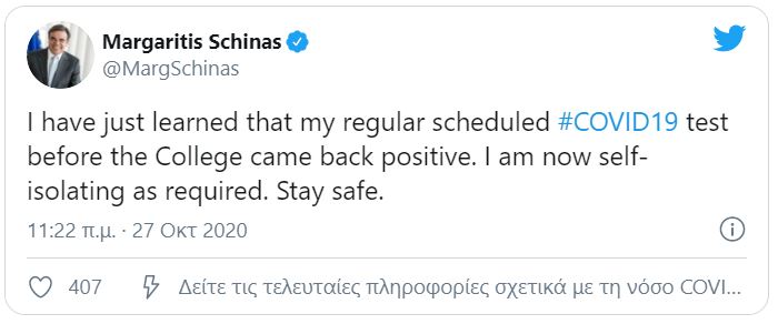 Την ανακοίνωση έκανε ο ίδιος ο επίτροπος για τον Ευρωπαϊκό Τρόπο Ζωής, κ. Μαργαρίτης Σχοινάς, μέσω του λογαριασμού του στο twitter.
