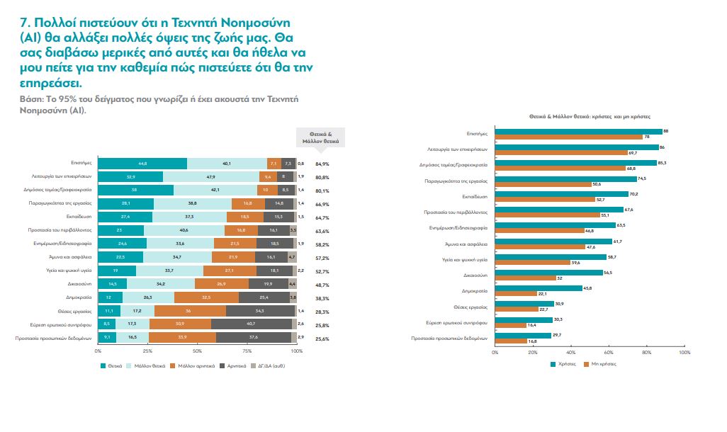 «Η επίδραση της ΤΝ στην ανθρώπινη ψυχική ισορροπία αξιολογείται αρνητικά από το 59,5% των ερωτηθέντων που γνωρίζουν ή έχουν ακουστά την ΤΝ («μάλλον αρνητικά» 35,3% και «αρνητικά» 24,2%). Ακόμα πιο δυσμενείς είναι οι προσδοκίες γύρω από την επίδραση στην κριτική σκέψη (33% «μάλλον αρνητικά» και 30,3% «αρνητικά»), στην ανθρώπινη εξωστρέφεια (38,1% «μάλλον αρνητικά» και 30,3% «αρνητικά») και τη σύνδεση με τους άλλους ανθρώπους (38,6% «μάλλον αρνητικά» και 39,9% «αρνητικά»)», προσθέτει.