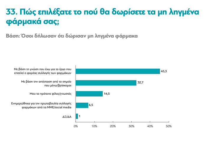 Πώς όμως πήραν την κάθε απόφαση; Σχεδόν 1 στους 3 (32,7%) αποφάσισαν πού θα δωρίσουν τα μη ληγμένα φάρμακα που δεν χρειάζονταν πια με βάση την απόσταση από το σημείο όπου βρίσκονται ή κατοικούν – ίσως γι’ αυτό και τόσοι πολλοί αποφάσισαν να τα επιστρέψουν σε ιδιωτικό φαρμακείο.