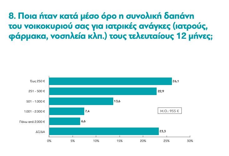 Επιπλέον, οι ερωτώμενοι υπολόγισαν το μέσο κόστος για τις ανάγκες της υγείας τους τον τελευταίο χρόνο στα 955 ευρώ.