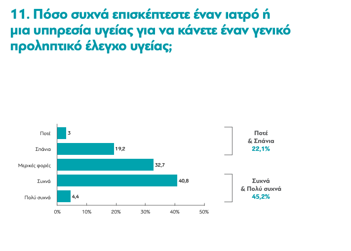 Στις ερωτήσεις που σχετίζονται με τον προληπτικό έλεγχο υγείας, περίπου 1 στους 2 (45,2%) δηλώνουν ότι επισκέπτονται συχνά ή πολύ συχνά γιατρό ή υπηρεσία υγείας για προληπτικό έλεγχο. Όμως κι εδώ φαίνεται ότι το κόστος παίζει κάποιο ρόλο, αφού εκείνοι με χαμηλότερο μηνιαίο εισόδημα ήταν λιγότερο πιθανό να κάνουν πιο συχνό προληπτικό έλεγχο. Από την άλλη πλευρά, οι γυναίκες δηλώνουν ότι κάνουν συχνότερο προληπτικό έλεγχο υγείας σε σχέση με τους άνδρες.