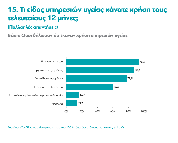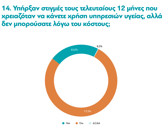- 22% όμως δήλωσαν ότι τον τελευταίο χρόνο υπήρξαν φορές που δεν έκαναν χρήση υπηρεσιών υγείας που χρειάζονταν λόγω του κόστους.