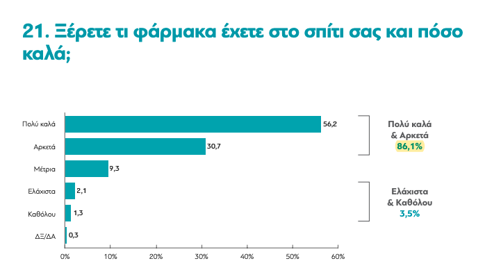 Όπως ίσως είναι αναμενόμενο η μεγάλη πλειοψηφία των ερωτώμενων (86,9%) δηλώνει ότι γνωρίζει πολύ καλά ή αρκετά καλά τα φάρμακα που υπάρχουν στο σπίτι τους. Ωστόσο, η έρευνα αναδεικνύει μια αντίφαση: παρότι τόσοι πολλοί δηλώνουν ότι γνωρίζουν ποια φάρμακα υπάρχουν στο σπίτι, μόνο 3 στους 10 δηλώνουν ότι ελέγχουν συχνά, τουλάχιστον μια φορά τον μήνα, τα φάρμακα αυτά.