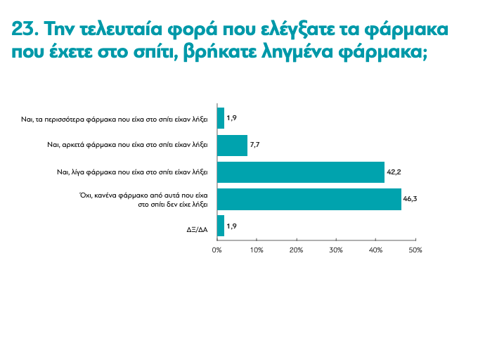 Από την άλλη πλευρά, 1 στους 2 δηλώνουν ότι τους περίσσεψαν φάρμακα τον τελευταίο χρόνο. Από όσα φάρμακα έχουν σπίτι τους, οι πολίτες δήλωσαν ότι, κατά μέσο όρο, περίπου 3 κουτιά είναι ληγμένα.