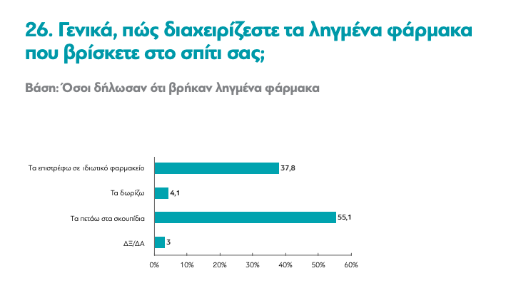 Τι κάνουν όμως με τα ληγμένα φάρμακα αφότου τα εντοπίσουν στο σπίτι τους; Περισσότεροι από τους μισούς (55,1%) δηλώνουν ότι τα πετούν στα σκουπίδια, πράγμα που αποτελεί πρόκληση για την προστασία του περιβάλλοντος, ενώ 37,8% των ερωτώμενων δηλώνουν ότι τα επιστρέφουν στα φαρμακεία.