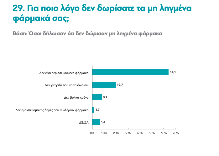 Από αυτούς, όπως είναι επόμενο, οι περισσότεροι (64,1%) δηλώνουν ότι δεν δώρισαν φάρμακα επειδή δεν τους περίσσεψαν. Όμως, η αμέσως πιο δημοφιλής απάντηση στην ίδια ερώτηση είναι ότι δεν δώρισαν φάρμακα επειδή δεν γνώριζαν πού να τα δωρίσουν – σχεδόν 1 στους 5 (19,7%) απαντούν με αυτό τον τρόπο.