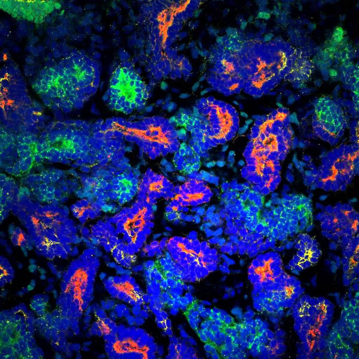 Στο βίντεο που ακολουθεί, μπορείτε να δείτε τις δομές που υπάρχουν εντός ενός mini-νεφρού από την βάση του προς την κορυφή. Στο κάτω μέρος μπορείτε να δείτε τις διακλάδωσης αγωγών συλλογής που συνδέονται με τα σωληνάρια των νεφρών (κίτρινο και μετά κόκκινο) που με τη σειρά τους είναι συνδεδεμένα με την πράσινη σπειροειδή διάταξη στην κορυφή. Credit: Minoru Takasato