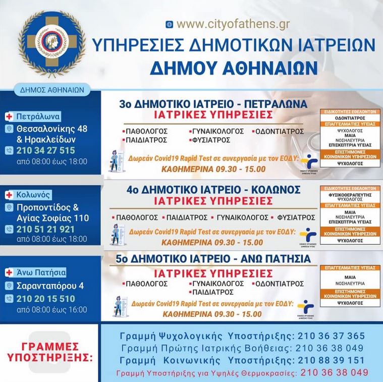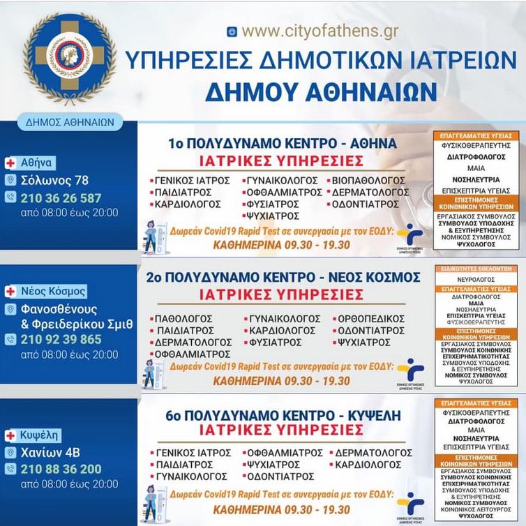 Υπενθυμίζεται πως ο δήμος Αθηναίων σε συνεργασία με τον ΕΟΔΥ πραγματοποιεί τεστ ταχείας ανίχνευσης Covid-19 σε όλα τα Ιατρεία, αλλά και στον ειδικά διαμορφωμένο χώρο στην 7η Κοινότητα (Πανόρμου 59 , 09:30-15:00, 2106993487).