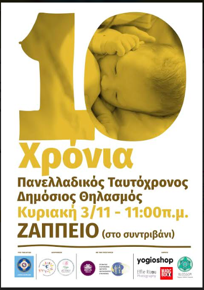Για 10η συνεχόμενη χρονιά, την Κυριακή 3 Νοεμβρίου 2019 και ώρα 11.00 π.μ. (ώρα προσέλευσης) μητέρες που θηλάζουν τα παιδιά τους θα συναντηθούν στο Ζάππειο Μέγαρο, δίπλα στο συντριβάνι, για να δώσουν το δικό τους μήνυμα για τα οφέλη του μητρικού θηλασμού. Η εκδήλωση έχει τίτλο «Ενδυναμώνουμε τους γονείς, διευκολύνουμε το θηλασμό».
