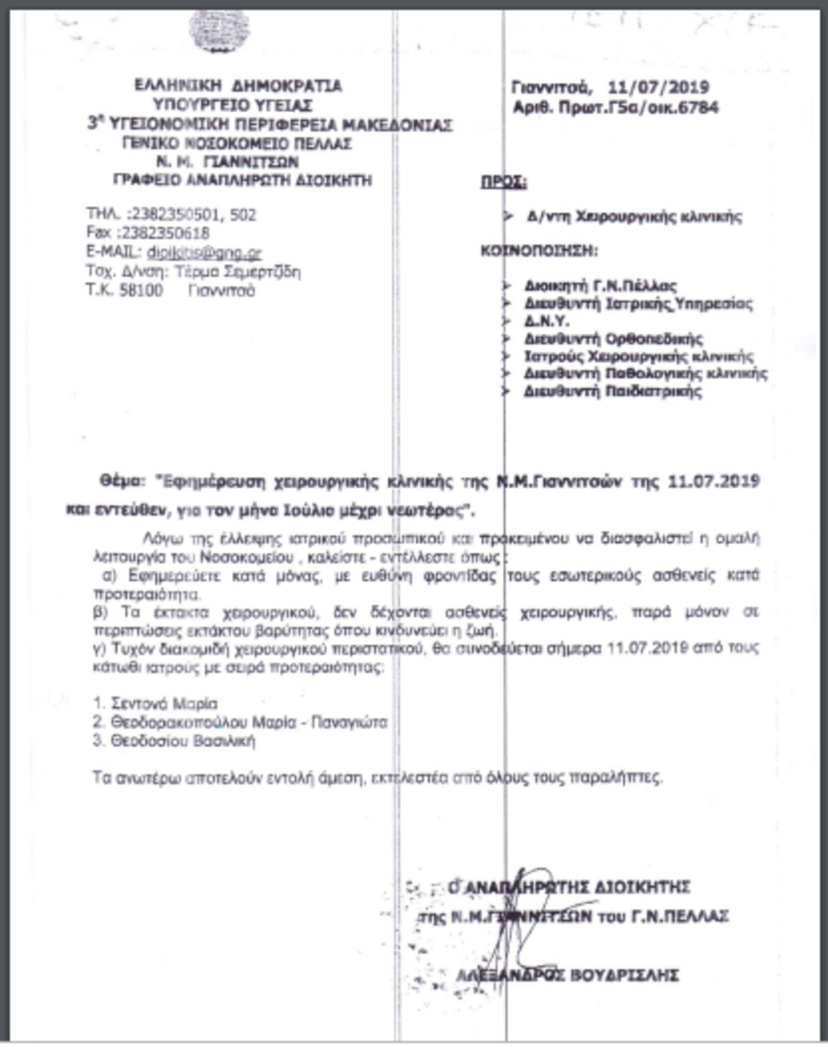 Δείτε την απόφαση του Διοικητή του νοσοκομείου Γιαννιτσών: