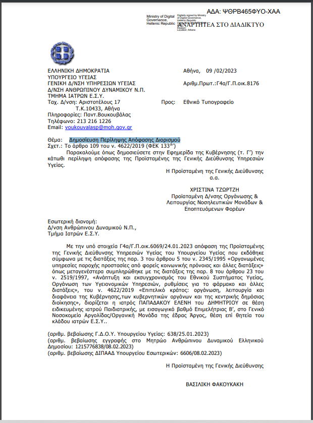 Συγκεκριμένα, αναφέρεται πως «διορίζεται η ιατρός ΠΑΠΑΔΑΚΟΥ ΕΛΕΝΗ του ΔΗΜΗΤΡΙΟΥ σε θέση ειδικευμένης ιατρού Παιδιατρικής, με εισαγωγικό βαθμό Επιμελήτριας Β’, στο Γενικό Νοσοκομείο Αργολίδας/Οργανική Μονάδα της έδρας Άργος, θέση επί θητεία του κλάδου ιατρών Ε.Σ.Υ».