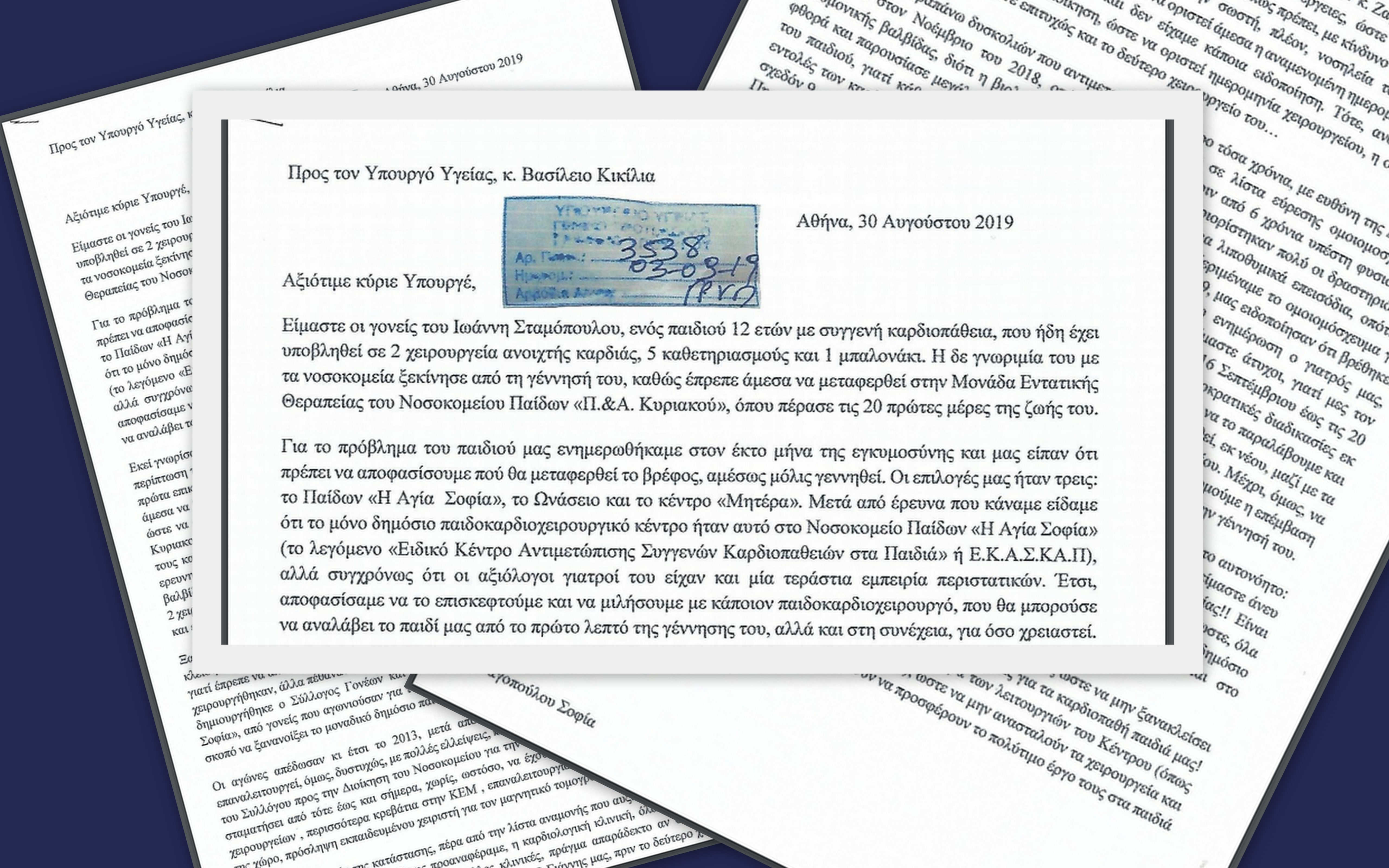 Οι γονείς του 12χρονου Γιάννη έστειλαν επιστολή στον υπουργό Υγείας κ. Βασίλη Κικίλια,, την οποία δημοσιεύει το infokids.gr, με την οποία ζητούν την παρέμβαση του, ώστε να δοθεί λύση στο πρόβλημα του παιδιού τους. Στην επιστολή παραθέτουν όλο το ιατρικό ιστορικό του Γιάννη, ο οποίος γεννήθηκε με σύμπλοκη καρδιοπάθεια: τετραλογία fallot και έλλειψη πνευμονικής βαλβίδας, ενώ έχει υποβληθεί έως σήμερα σε 5 καθετηριασμούς, ένα μπαλονάκι και δύο χειρουργεία ανοιχτής καρδιάς: