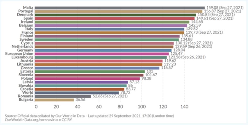Τέλος, σύμφωνα με την έκθεση του παρατηρητηρίου, από τις 27 Δεκεμβρίου 2020, που ξεκίνησαν οι εμβολιασμοί, ο αθροιστικός αριθμός εμβολιασμών στις 29 Σεπτεμβρίου ανερχόταν σε 12.112.128, έναντι 11.960.582 στις 22 Σεπτεμβρίου. Συνολικά έως στις 29 Σεπτεμβρίου, έχουν πραγματοποιηθεί 6.439.087 εμβολιασμοί τουλάχιστον μίας δόσης και 6.107.955 ολοκληρωμένοι εμβολιασμοί (δηλ εμβολιασμοί δύο δόσεων ή μονοδοσικοί εμβολιασμοί). Το παρακάτω γράφημα συνοψίζει τους συνολικούς εμβολιασμούς ανά 100 κατοίκους στην ΕΕ των 27 κρατών μελών με το ποσοστό της Ελλάδας να ανέρχεται σε 116,57% στις 28 Σεπτεμβρίου.