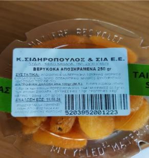 στοιχεία «ΒΕΡΥΚΟΚΑ ΑΠΟΞΗΡΑΜΕΝΑ» σε πλαστική κλειστή συσκευασία 250γρ, με αριθμό παρτίδας 02-251 και ανάλωση έως: 18/08/2024, που συσκευάζεται από την επιχείρηση «ΚΑΡΠΟΣ» Σιδηρόπουλος Κ. & ΣΙΑ Ε.Ε., με έδρα τη Λυδία Ν. Καβάλας.