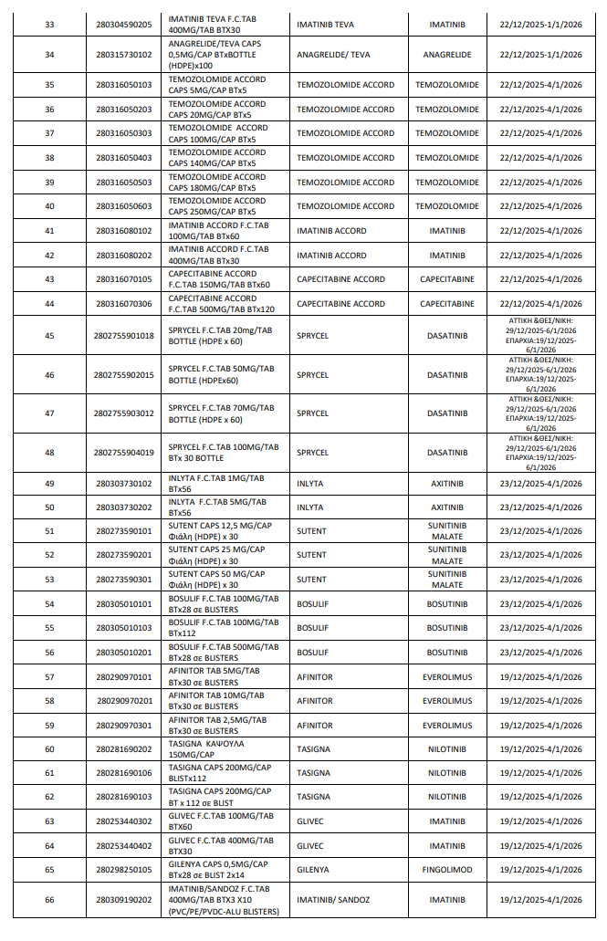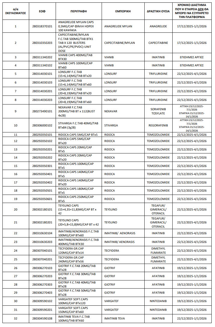 Στην ανακοίνωση αναφέρεται πως κατά την περίοδο των Χριστουγέννων και λόγω αδυναμίας ορισμένων φαρμακευτικών και μεταφορικών εταιρειών, η διεκπεραίωση αιτημάτων για χορήγηση Φαρμάκων Υψηλού Κόστους από ιδιωτικά φαρμακεία που υποβάλλονται μέσω της πλατφόρμας θα είναι δυνατή σύμφωνα με τον πίνακα, ο οποίος περιλαμβάνεται στην ανακοίνωση.