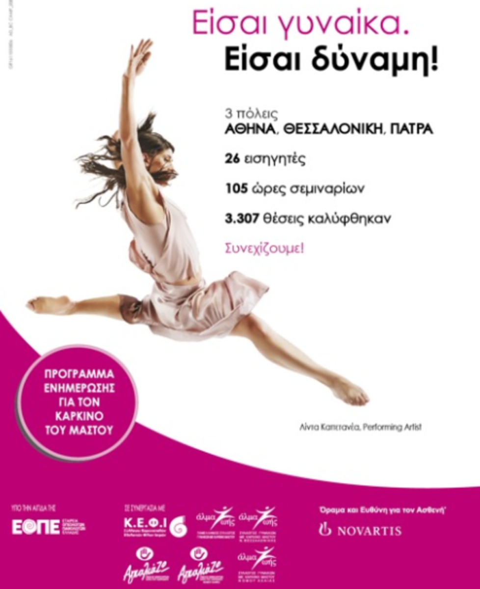 Ο στόχος της Novartis είναι να θέσει τη γυναίκα ασθενή στο επίκεντρο παρέχοντας της τα μέσα που θα τη βοηθήσουν να ανταπεξέλθει με σθένος και αυτοπεποίθηση στον αγώνα της. Τα βιωματικά σεμινάρια έχουν υλοποιηθεί ήδη στην Αθήνα, την Πάτρα και τη Θεσσαλονίκη και γνώρισαν τεράστια επιτυχία. Συνολικά μίλησαν 26 εισηγητές, πραγματοποιήθηκαν 105 ώρες μαθημάτων και καλύφθηκαν 3307 θέσεις στο πλαίσιο των σεμιναρίων.
