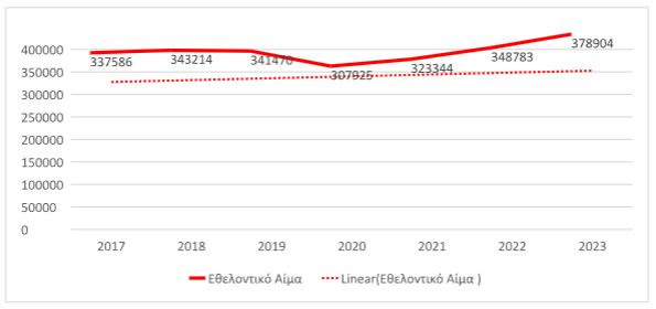 Από τις 550974 μονάδες αίματος που συγκεντρώθηκαν το 2023 , οι 378904 μονάδες συγκεντρώθηκαν από Εθελοντές Αιμοδότες ήτοι 68,7% της συνολικής συλλογής αίματος . Το 2023 συγκεντρώθηκαν 30162 μονάδες περισσότερες από το 2022 , που το ποσοστό του εθελοντικού αίματος ήταν 65% , μια βελτίωση της τάξης του 3,7%.