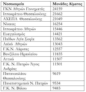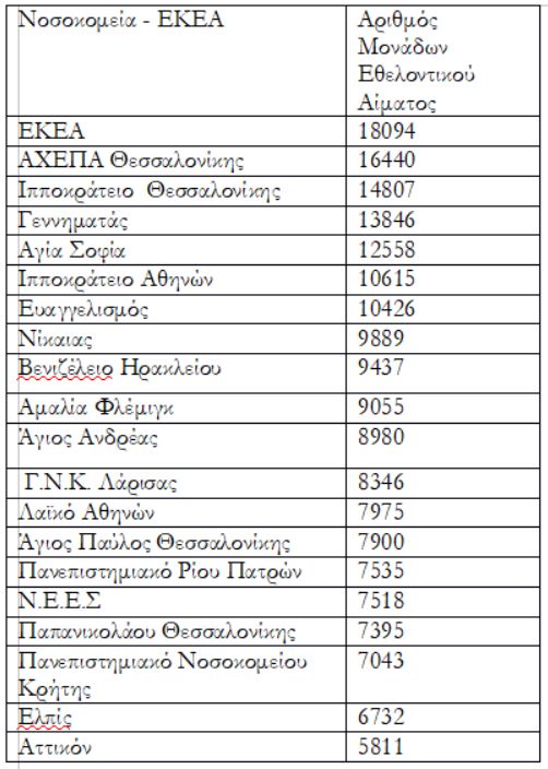 Έτσι τα είκοσι καλύτερα νοσοκομεία με κριτήριο τον αριθμό των μονάδων αίματος που συλλέγουν , είναι τα κάτωθι: