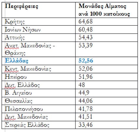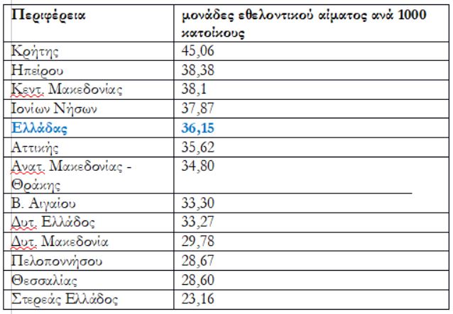Ειδικότερα η εικόνα της συλλογής εθελοντικού αίματος ανά περιφέρεια και στην επικράτεια αποδίδεται στον κάτωθι πίνακα.