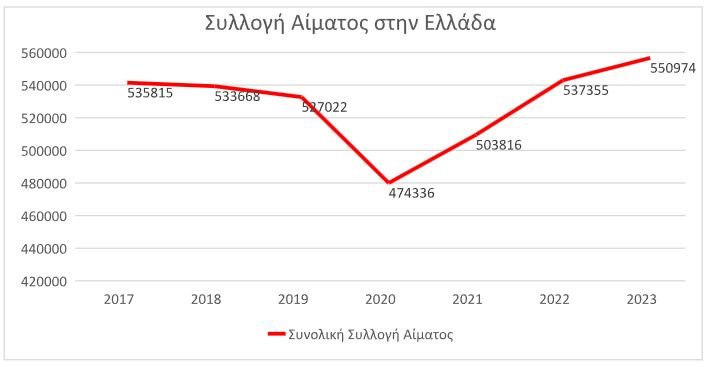 Στην Ελλάδα συλλέχθηκαν 36,15 μονάδες εθελοντικού αίματος ανά 1000 κατοίκους , έναντι 32.98 μονάδων ανά 1000 κατοίκους το 2022.