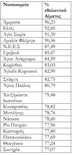 Με κριτήριο το ποσοστό του Εθελοντικού αίματος που συλλέγουν , τα είκοσι νοσοκομεία με τις καλύτερες επιδόσεις , είναι :