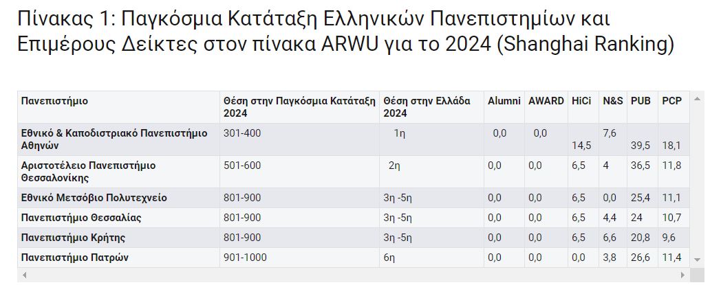 - στην 1η θέση στην Ελλάδα μεταξύ των έξι Πανεπιστημίων που βρίσκονται στο top 1000, και μάλιστα συγκεντρώνοντας τον υψηλότερο βαθμό σε όλα τα επιμέρους κριτήρια στα οποία έλαβαν βαθμό τα Ελληνικά Πανεπιστήμια (Βλέπε Πίνακα 2).