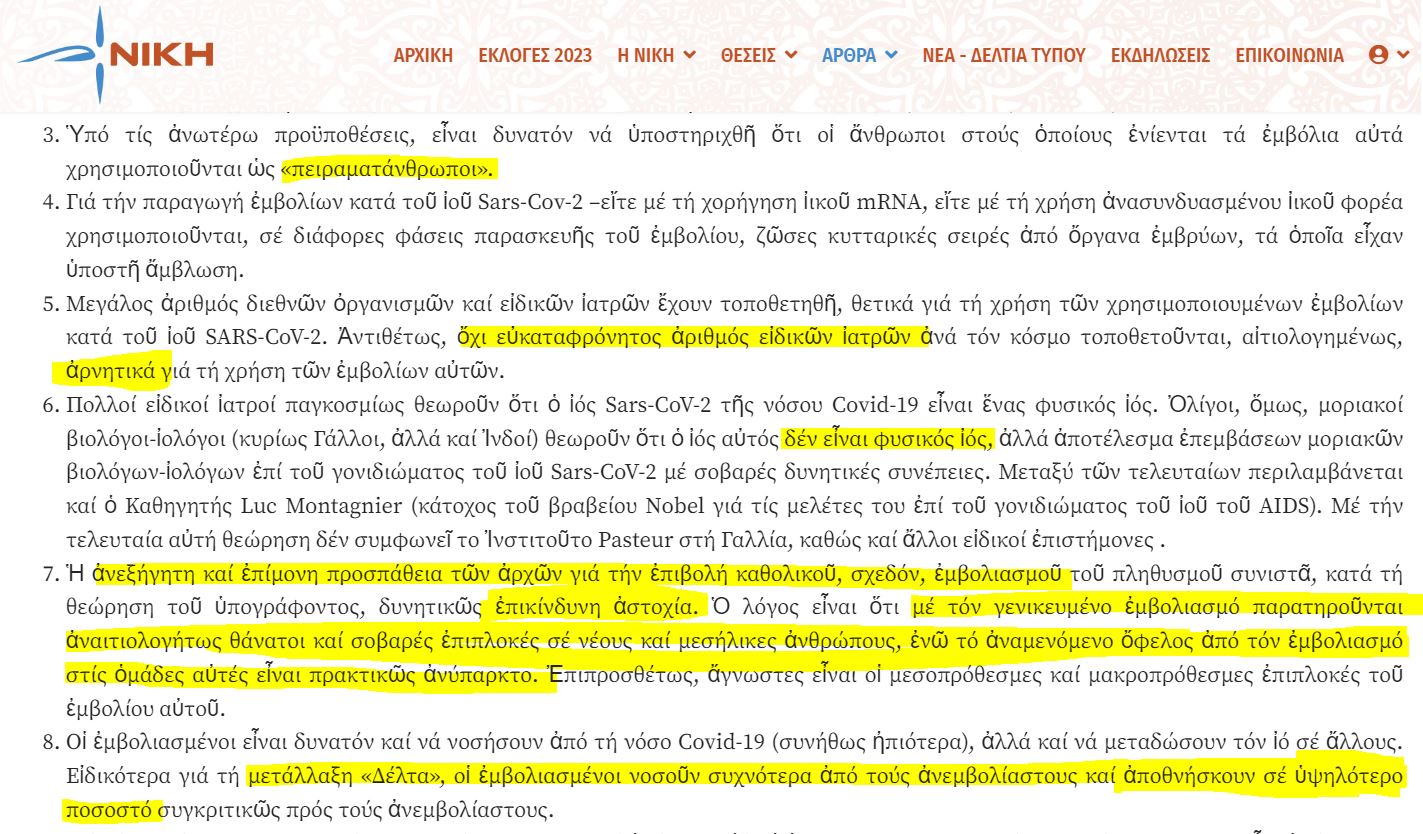 Σε ό,τι αφορά τον κορονοϊό; Στην επίσημη ιστοσελίδα του κόμματος “Νίκη” είναι σαφές πως ο ιός δεν είναι πιο κολλητικός σε ιερούς ναούς, απ΄ ότι σε σούπερ- μάρκετ και λεωφορεία, ενώ άρθρα σχετικά με τα εμβόλια κατά της COVID-19, συνηγορούν υπέρ της «επικινδυνότητας».